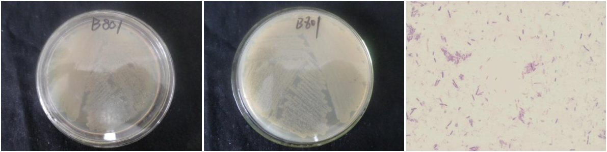 | Morphological Description | Colony round;clam white;Fine spines on the edge;Slightly convex on the edge;have concentric rings;convex in the middle;slippy;sticky;Waxed;Rod;having spore;Mesophilic budding spore |