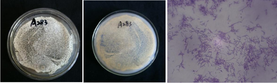 | Morphological Description | Mycelia branch less;separation is not broken;mycelia all broken into irregular short cut secondary mycelia fine into curly growth;fracture;there is a larger near round spore colony on the short stalk |
