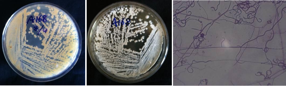 | Morphological Description | Hyphae branched;separated without fracture;spore filaments curved or spiral;spore round or elliptic spore piles are deciduous pale pink;back brown |