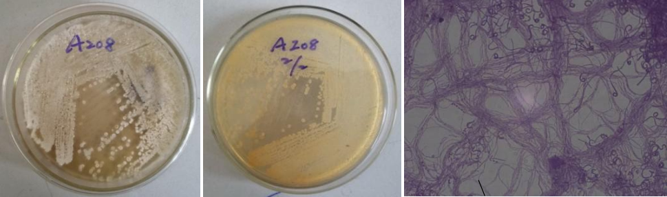 | Morphological Description | Mycelia branching;separated without fracture;short filaments;straight and curved or spiral spore filaments;spore long round spore pile white;back mango reed color |