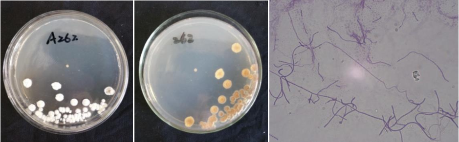 | Morphological Description | hyphae:branched without breaking apart;branches:short and thicker;spore filaments:curved;long;and broken into Rod-shaped spores;Spore piles:milky white;back:soybean juice yellow |