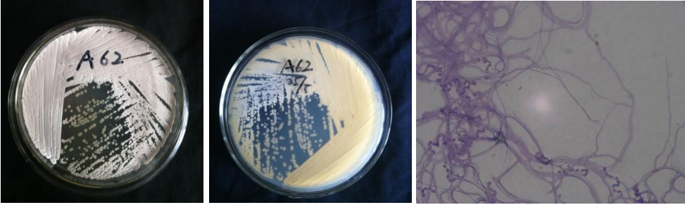 Morphological Description The morphology of strain:hyphae branch;Luxuriant;divided;fasciculate;spore chain bent;spore large;old silky in fascicles;vacuolated;not many not much;Spore heap milky white;extremely thin;back soy sau