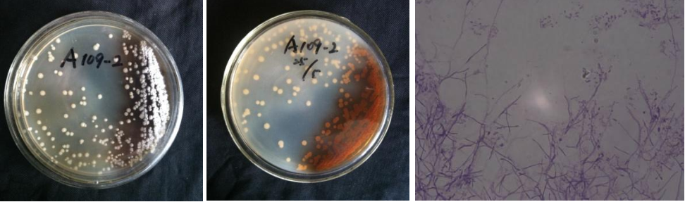 | Morphological Description | The morphology of strain:hyphae branch;Septum;hyphae thicker;spore filaments stubby;tip forming an enlarged spore;Very few milky spore piles;mostly bald;back brownish red |