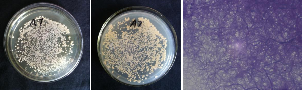 | Morphological Description | The morphology of strain:branched and luxuriant mycelium;protoplasm beginning to coalesce;mycelium in bundles;short and straight spore chains;no spore mounds with ivory white on the back |