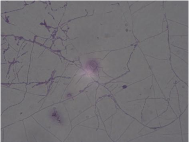 | Morphological Description | Mycelia branch;some filaments have broken into barrel-shaped spores;mycelia fine;spore silk slightly thick;straight;long;broken into Rod-shaped spores pile gray;brown back |