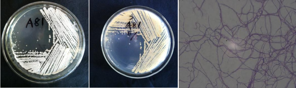 | Morphological Description | mycelium bunched;thick;apart;broken;spore chains long;curved;some broken into clains;front and back of spore pile light yellow |
