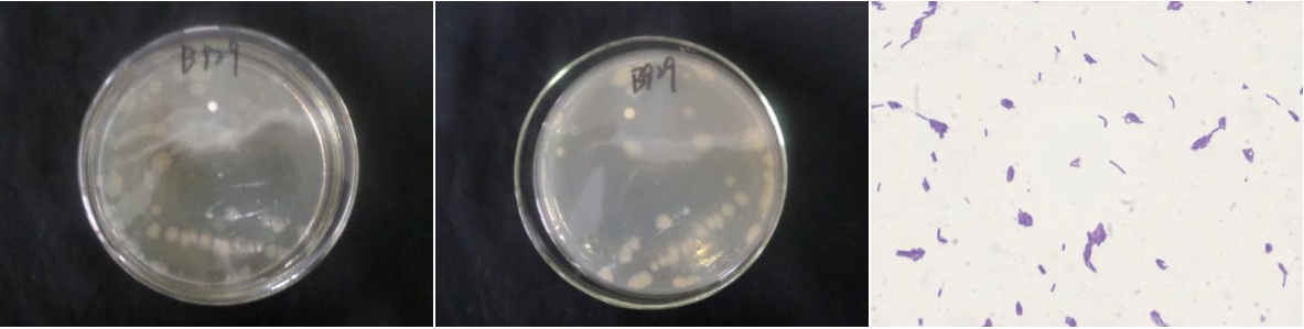 | Morphological Description | Colony round;clam white;edge serrated;Flattened;have concentric rings;multifold;slippy;sticky;Waxed;Rod;having spore;Mesophilic budding spore |